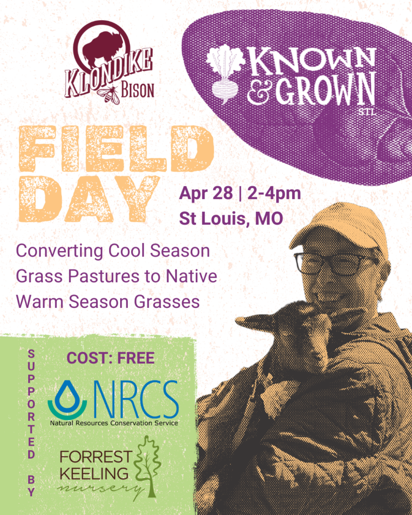 Join us at Klondike Bison & Bee as Peggy Ladd teaches us the ins and outs of transitioning a pasture from cool-season grasses to native warm-season grasses. Warm-season grasses improve summertime forage, drought tolerance, and beneficial native habitat to create resilience, adaptability, and ecological advantages. You’ll also get a rare glimpse of the bison. No petting allowed. 😉